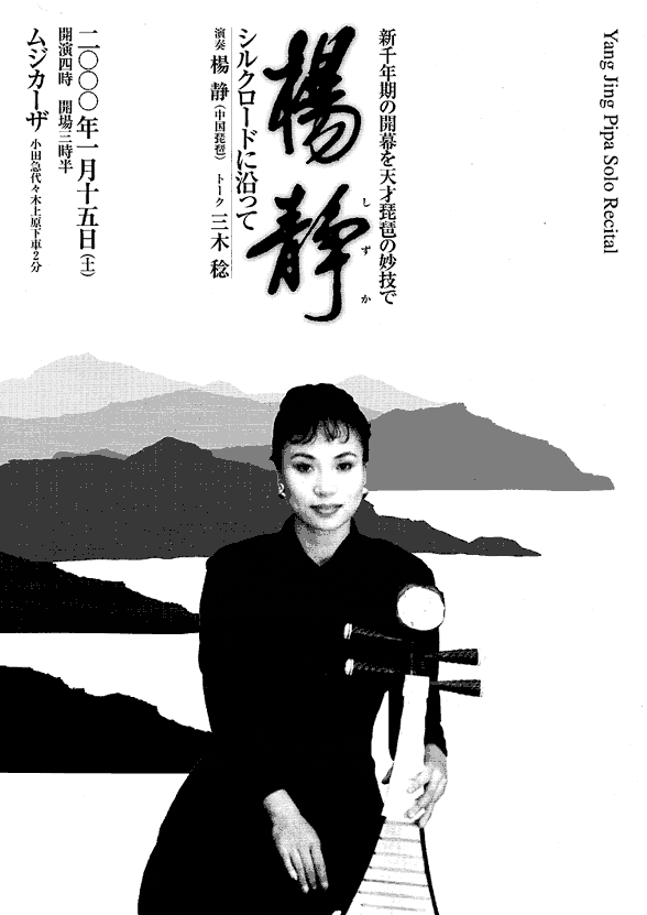 | 中国琵琶ソリスト 楊静 この1年の話題から 99年1月25日サントリーホールの都響定期で、三木稔作曲《琵琶協奏曲》の通常オーケストラ版を初演した楊静は、始めての聴衆から異常ともいえる回数の熱いアンコールを受けた。専門家の批評も100%極めてポジティヴであった。例えば− ◆楊静の弾く中国琵琶の魅力にすっかり圧倒された。バチ無しで義爪だけの弾奏だがその指捌きの鮮やかさは目もくらむぱかりで、アルペジオ、グリッサンド、ハーモニックスなど、繊細で多彩な音色はまるで虹のよう。デリケートな詩から情熱的な劇まで、楽器の個性を生かし切った表現力、訴求力に強く惹き込まれた。(結城亨、音楽之友3月号) ◆(三木の)「琵琶協奏曲」、楊静による輝かしい琵琶独奏(長木誠司、朝日2月8日) ◆(三木の)琵琶協奏曲は、唐時代の詩人白楽天の詩「琵琶行」に触発して書かれ、詩の内容に沿って音楽も展開。ソロの中国琵琶演奏を充分すぎるくらい堪能できるように配慮して構成されている。幼い頃から琵琶を始め、現在プロの奏者として世界で活躍中の楊静の演奏は実に見事だった。全般的に琵琶のヴィルトゥオーソ的な活躍が目立ったが、例えば第二楽章で静に叙情的に歌われる旋律なども、深さと渋みのある演奏で、楊の力量の大きさが窺われた。(鈴木香桜梨、音楽の世界3月号) 9月3日、イングランド中部の町チェスワーデンでは、前年の楊静のボランティア演奏に感動した町民が、改装したホールに"Yang Jing Hall"の名を冠し、彼女のソロコンサートで再オープン。11日、イギリス・クラシック音楽界の夏の大イヴェントBBC PROMSのトリを飾る国民的行事"Last Night Concertt"に、民族楽器奏者として異例の出演をし、BCCウエールズ書と共演。雨中、名勝スワンシーの公園に集まった5000人の聴衆の大喝采を浴びる。 中国最大の北京国際音楽祭では、楊静をリーダー(Artistic Director)とする中国民族絃楽器四重奏団「郷梅静月」が、民族楽器を代表して、11月14日北京音楽庁(Beijing Concert Hall)に超満員の聴衆を得てコンサートを開催。三つのTV、新聞がこぞって報道。同内容のCDも発売される。この楽団は、北京の音楽のメッカである北京音楽庁が年数回主催コンサートを行っており、中心となっての演奏やプロデュース、さらに編曲・コメンテーターを務める楊静ともども急速に人気を高めている。尚、三木の《水廻る》《タ影の詩》が演奏され、楽団の方向を司るSupervisorを委任されている。 |